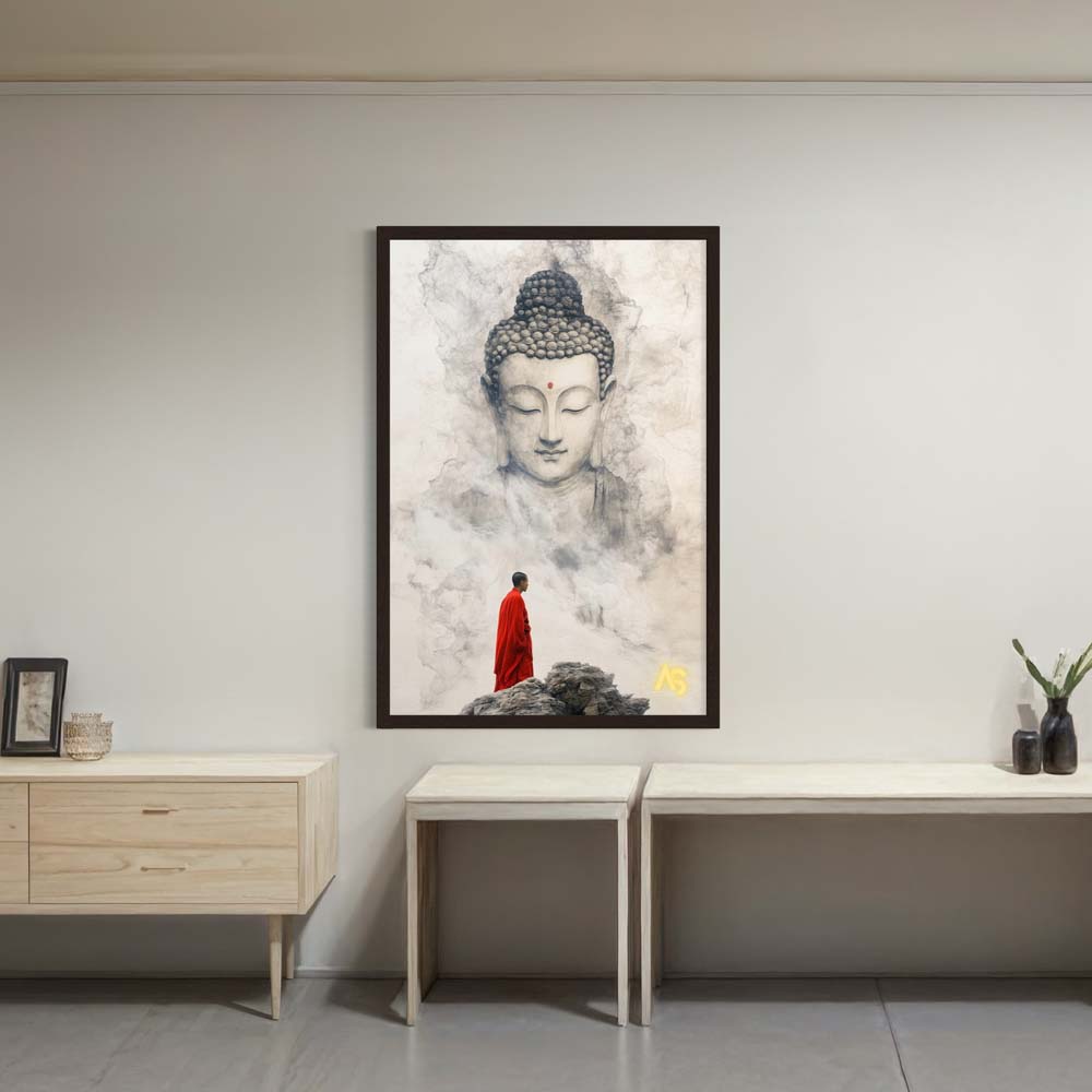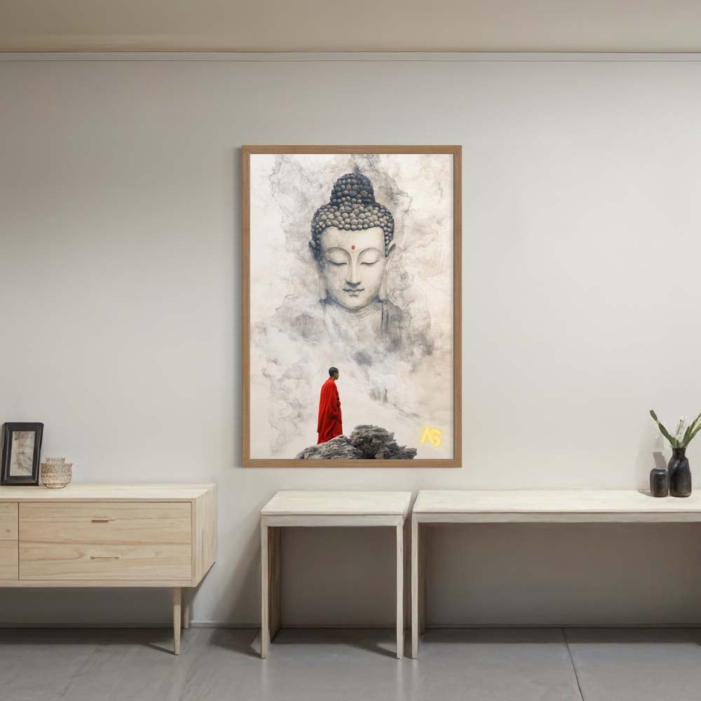 Set against a dreamlike, misty background, the monk’s crimson robe symbolises dedication, wisdom, and the sacred path to self-realisation. Above him, an ancient Buddha face emerges from the celestial mist, reflecting guidance, transcendence, and divine connection.