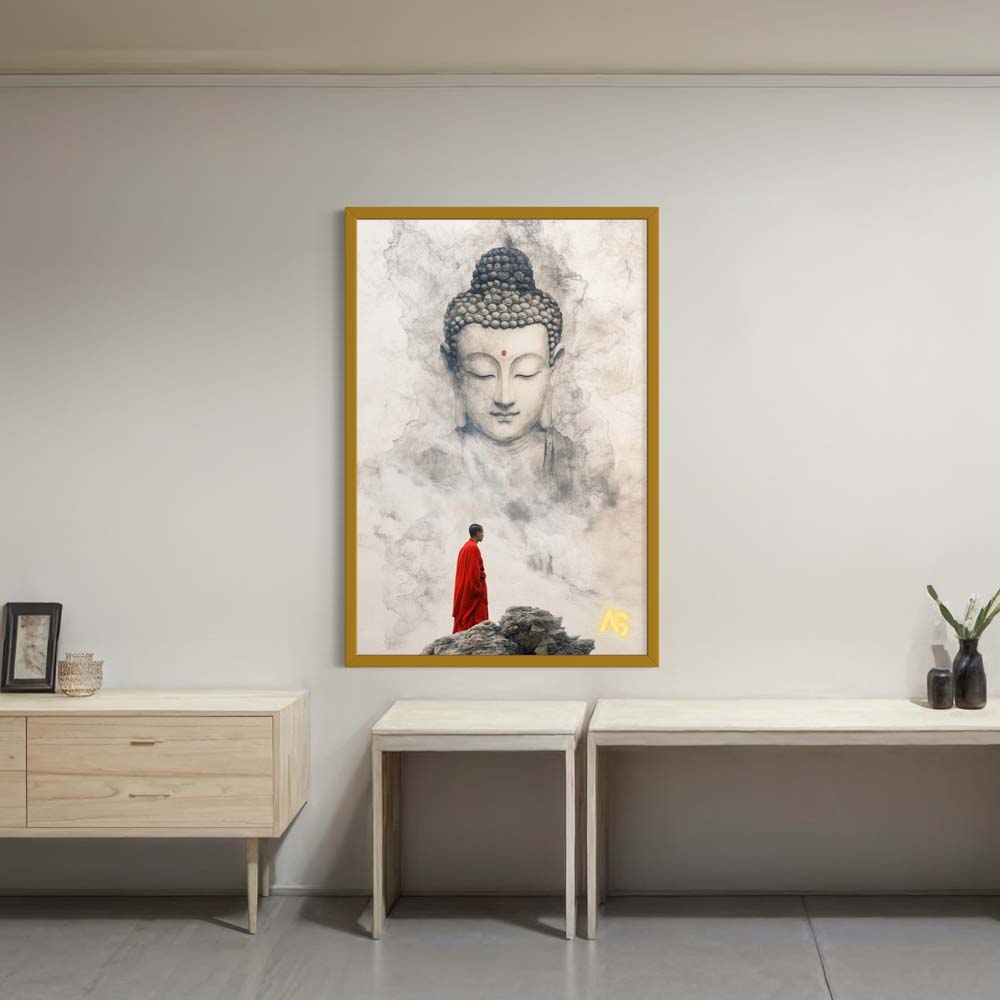 This captivating artwork embodies the essence of spiritual enlightenment and devotion, portraying a monk in deep contemplation beneath the ethereal presence of Buddha.