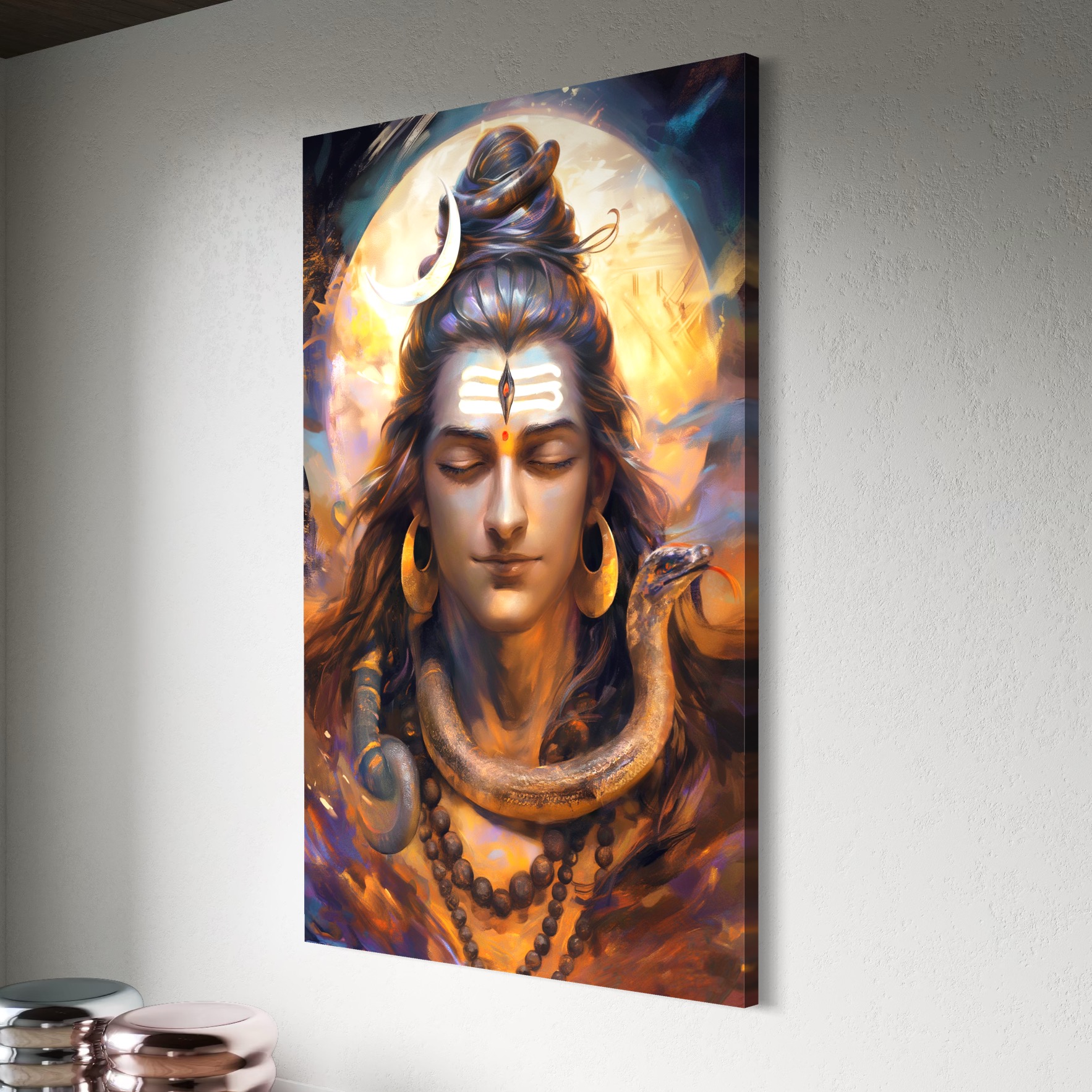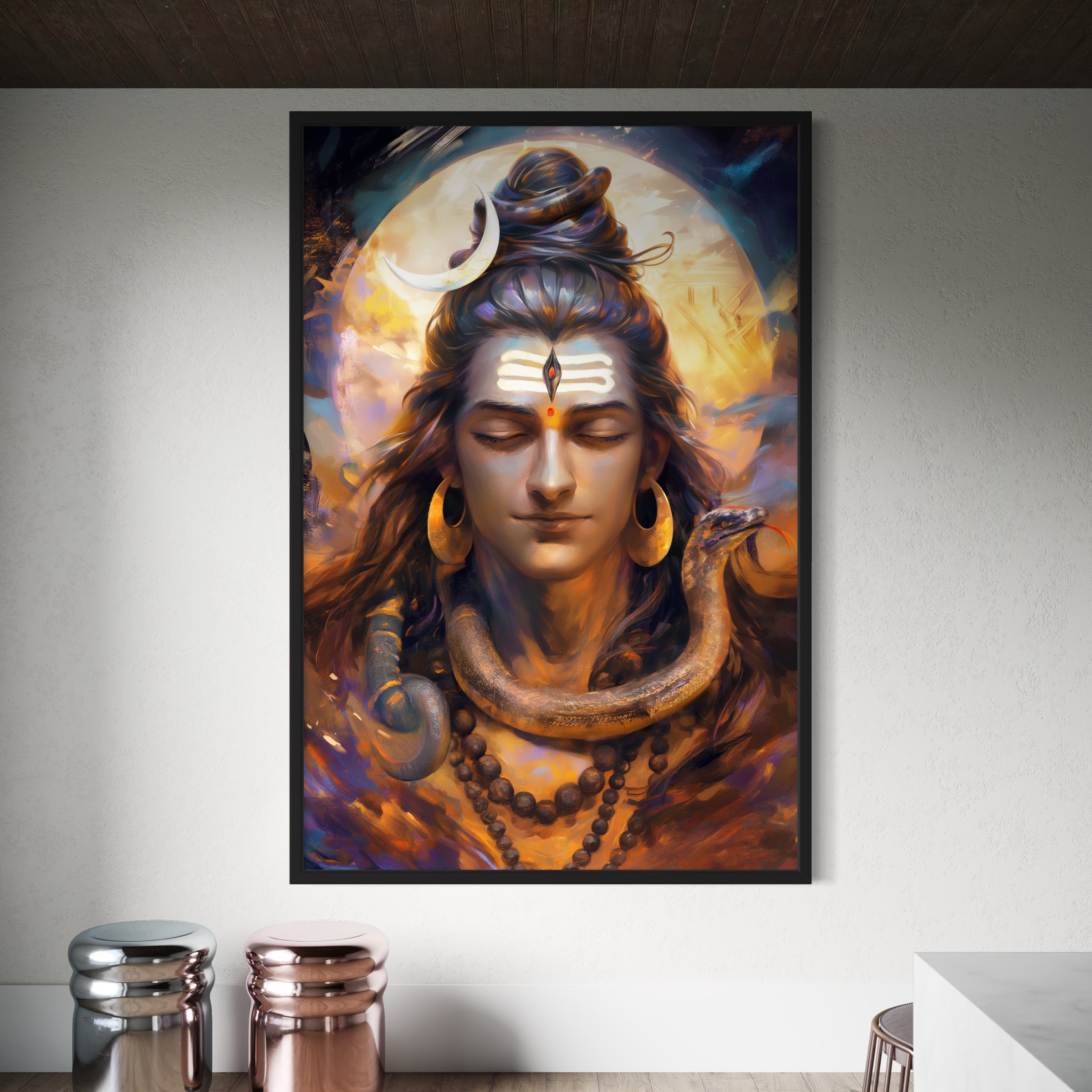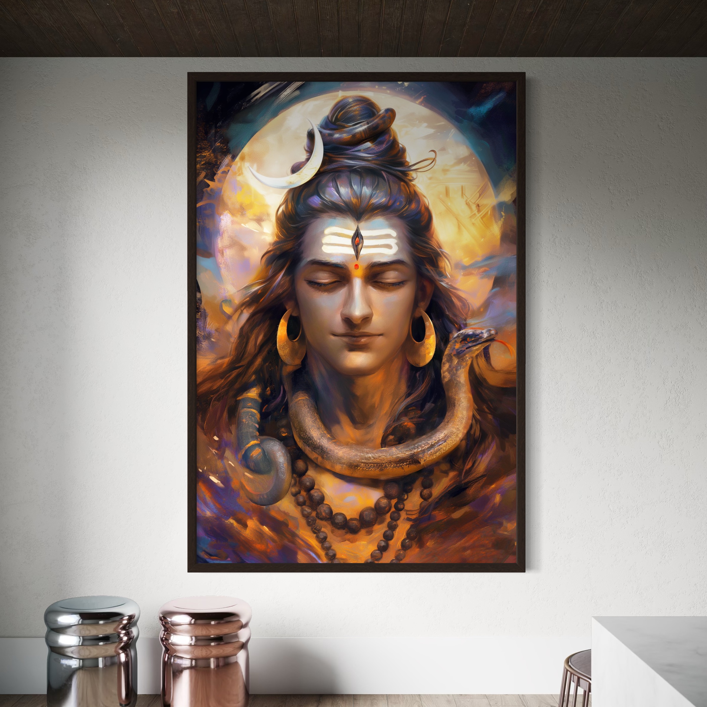 Immerse yourself in the divine stillness of Mahadev captured in this high-definition digital painting. With eyes closed in cosmic meditation, adorned with a glowing crescent moon, rudraksha malas, and the sacred serpent, Lord Shiva radiates an aura of inner peace and immense power. This artwork brings a celestial calm into any space it graces.