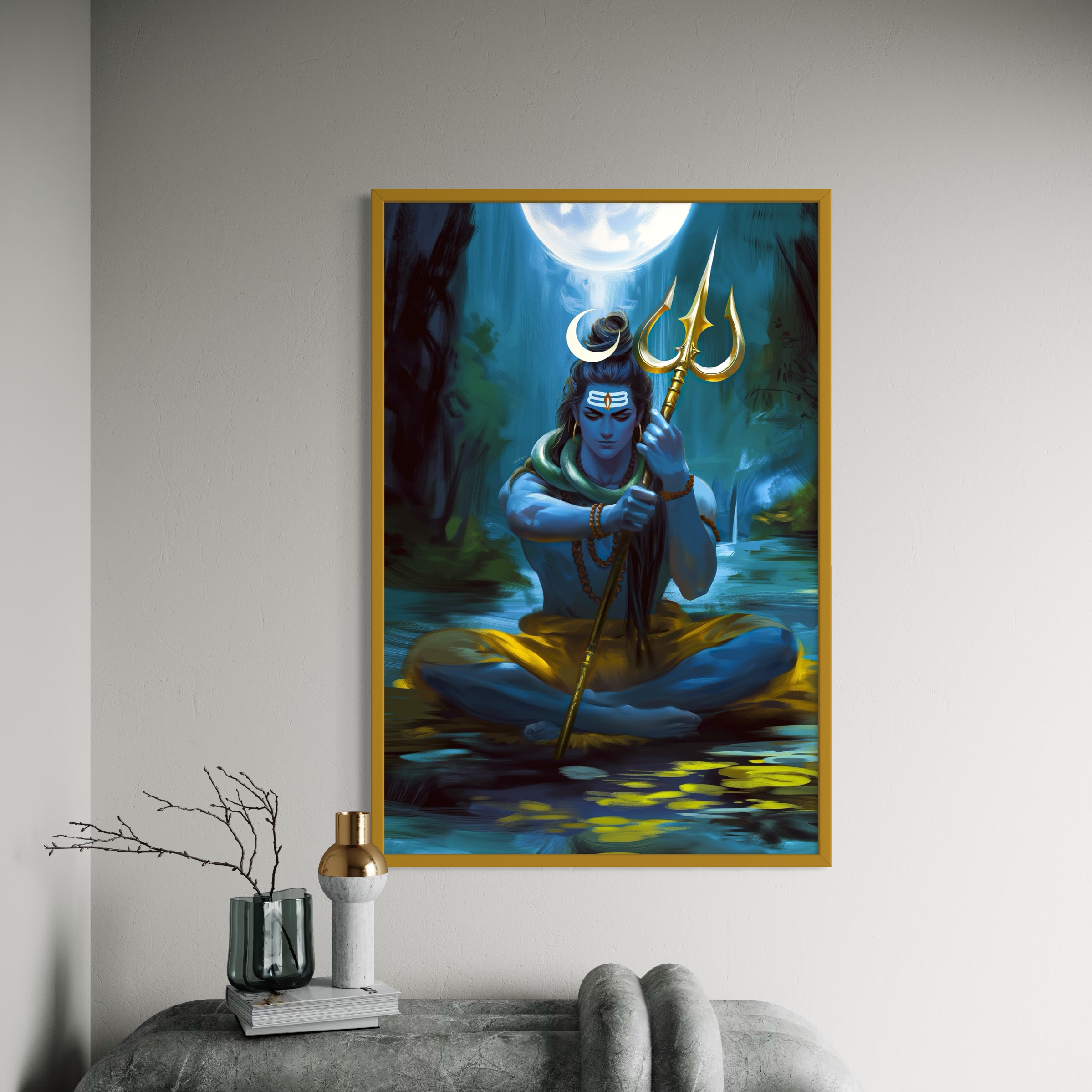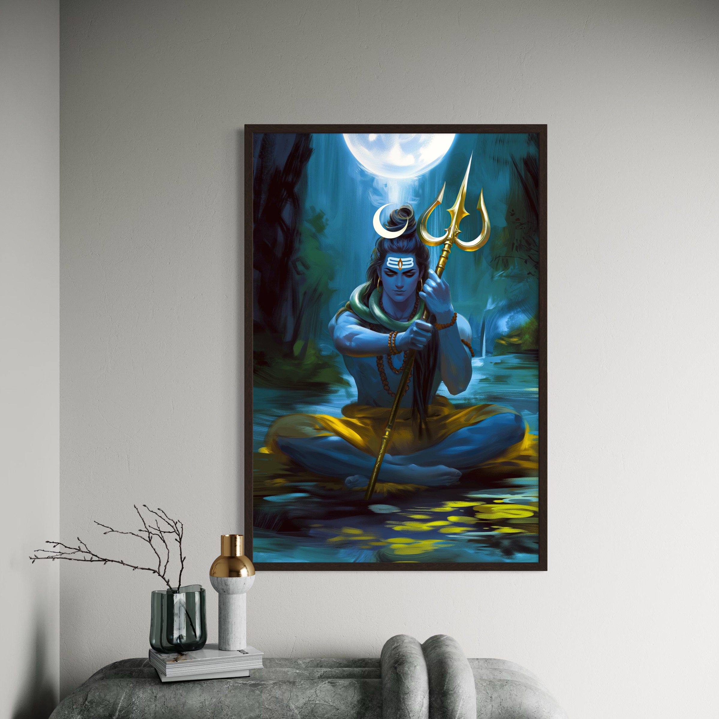This captivating artwork captures Lord Shiva in serene meditation, bathed in the glow of the full moon. With his iconic Trishul aligned at the center and the crescent moon shining above, the divine energy flows calmly through the composition—symbolizing inner strength, clarity, and cosmic stillness. The glowing waters beneath mirror his unwavering presence, offering tranquility and reverence.