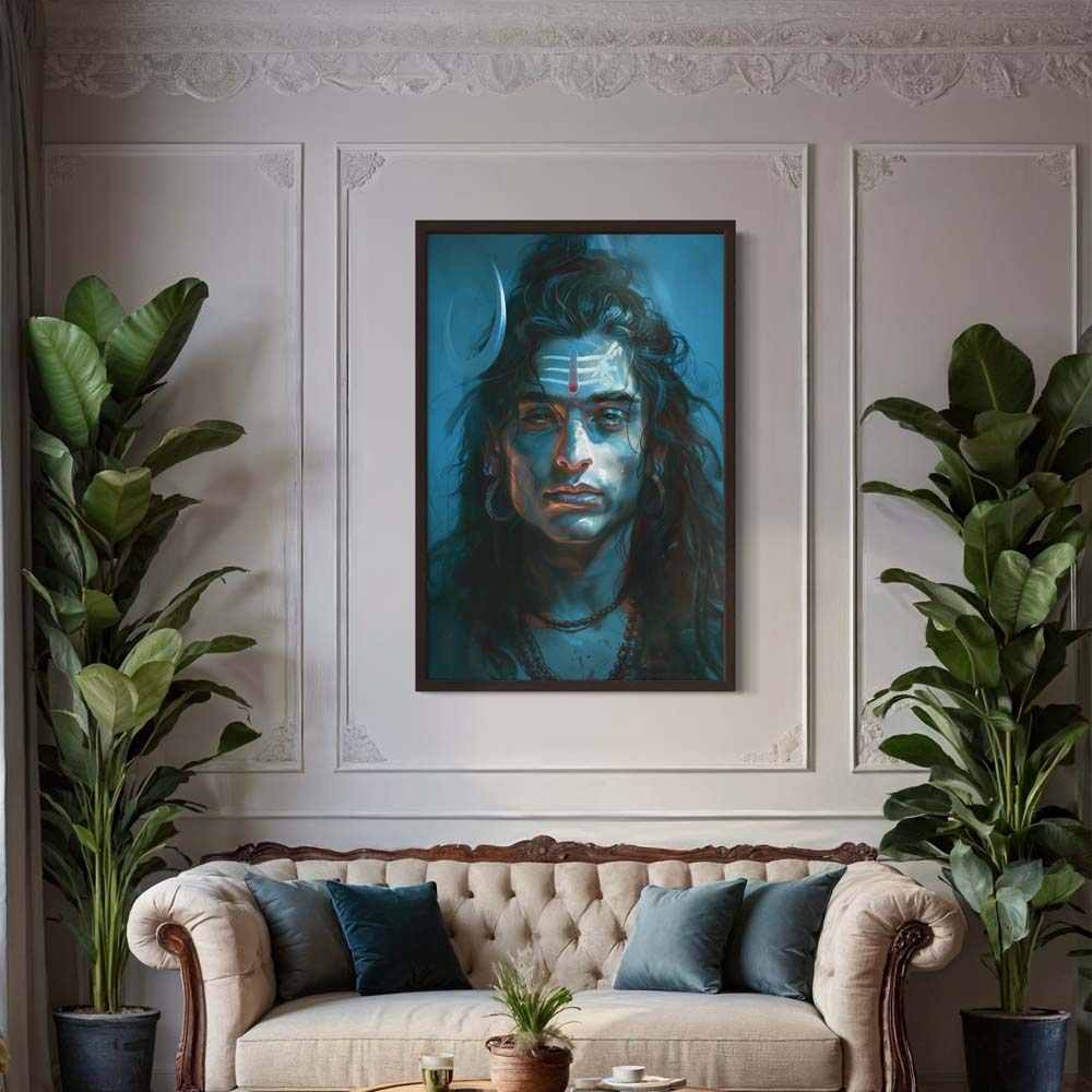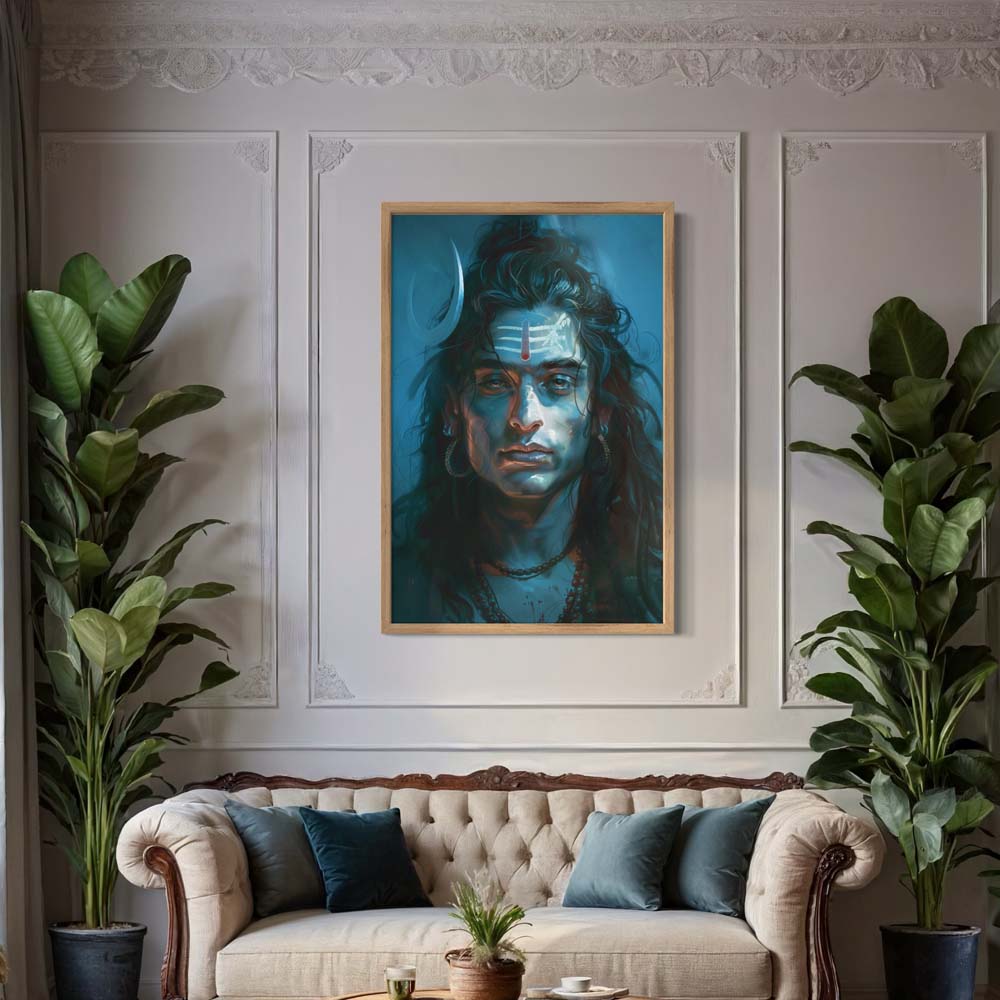 This powerful artwork captures the intense gaze of Lord Shiva, radiating divine energy, mysticism, and cosmic authority. The fierce yet tranquil expression symbolises Shiva’s duality as both a destroyer and a nurturer. His iconic crescent moon glows faintly against the deep, ethereal blue backdrop, while the sacred tripundra on his forehead reflects spiritual enlightenment. The vivid details in his piercing eyes and wild hair create an aura of awe and reverence, invoking a sense of connection to the infinite cosmos.