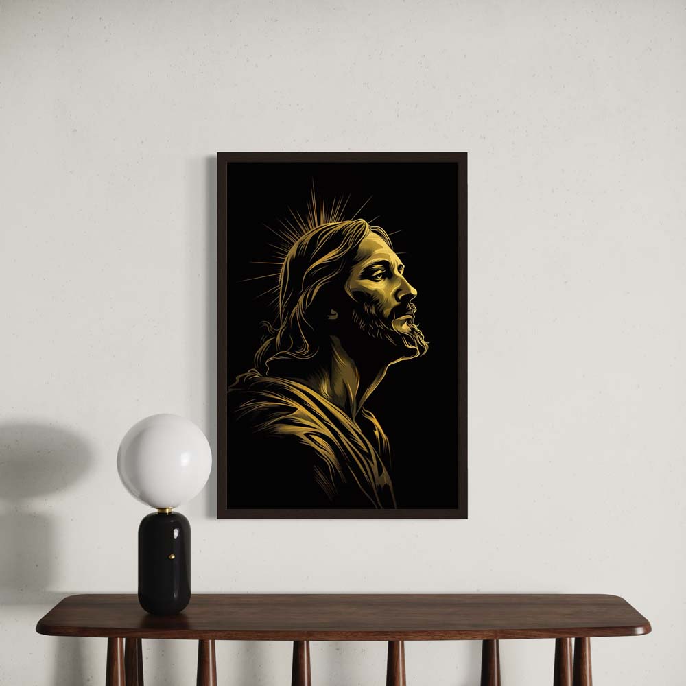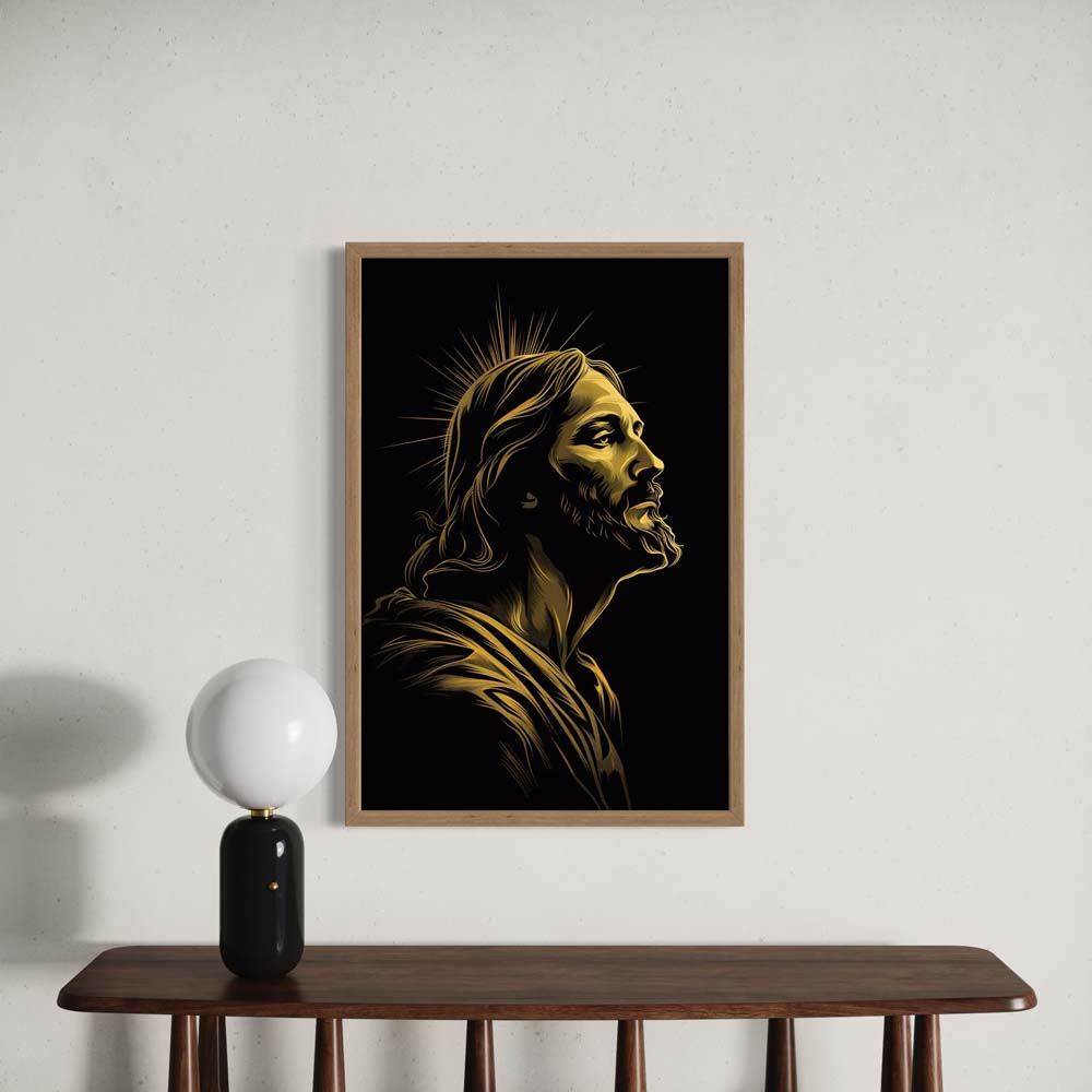 This striking modern abstract portrait of Jesus Christ uses vivid golden hues against a deep black background to create a powerful and dynamic visual impact. The interplay of light and shadow emphasises His divine radiance and spiritual significance. The flowing lines symbolise grace and eternal love, while the sharp golden accents represent enlightenment and hope. This artwork combines contemporary artistry with timeless spirituality, making it an eye-catching centrepiece.