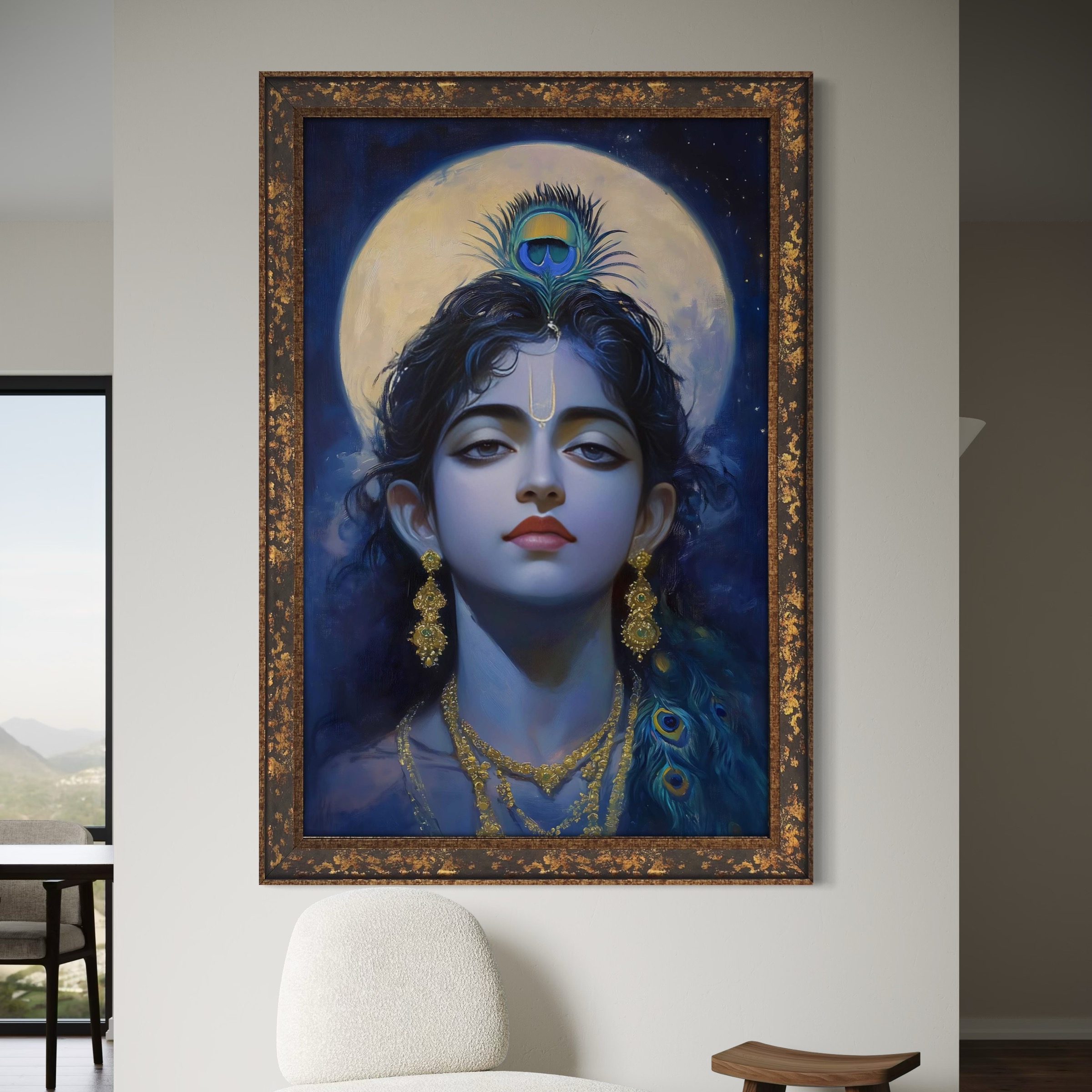 This magnificent digital painting radiates the celestial charm of Lord Krishna. Draped in a royal blue garment and adorned with golden jewelry, Krishna’s upward gaze reflects wisdom, grace, and serenity. The glowing halo behind him amplifies his divine essence, making this artwork a symbol of spiritual strength and transcendence. With every brushstroke, the beauty and soulfulness of Krishna come alive, capturing the hearts of devotees and art admirers alike.