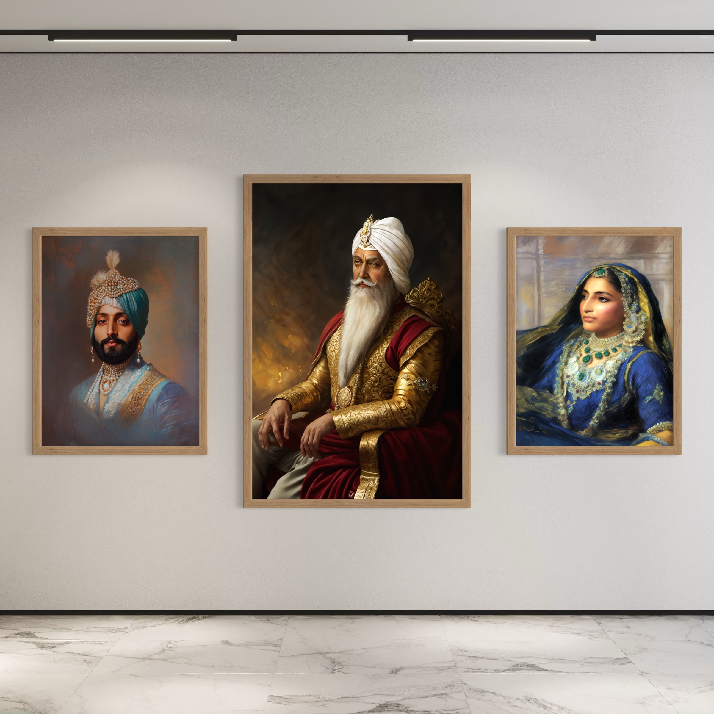 The portrait of Maharani Jind Kaur, the last queen of the Sikh Empire, captures her grace, strength, and regality. Draped in a royal blue attire, intricately embroidered with gold accents, she exudes elegance and dignity. Her jewelry, adorned with emeralds, pearls, and diamonds, reflects the opulence of the Sikh court, symbolizing her unmatched stature and influence. The soft brushstrokes and luminous textures bring to life her serene yet powerful aura, celebrating her legacy as a resilient leader and a symbol of feminine strength.