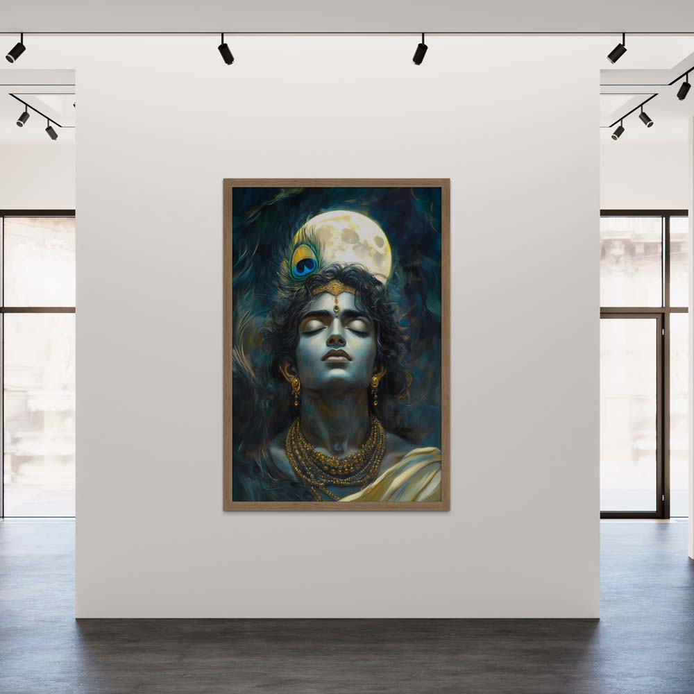 This mesmerizing artwork portrays Lord Krishna in a state of divine tranquility, bathed in the soothing glow of the full moon. The intricate detailing captures Krishna’s serene expression, symbolising peace, devotion, and spiritual enlightenment. The luminous moonlight, coupled with the vibrant peacock feather and adorned golden jewelry, amplifies the celestial aura surrounding him. This masterpiece reflects Krishna’s eternal charm and divinity, captivating the viewer with its ethereal beauty.