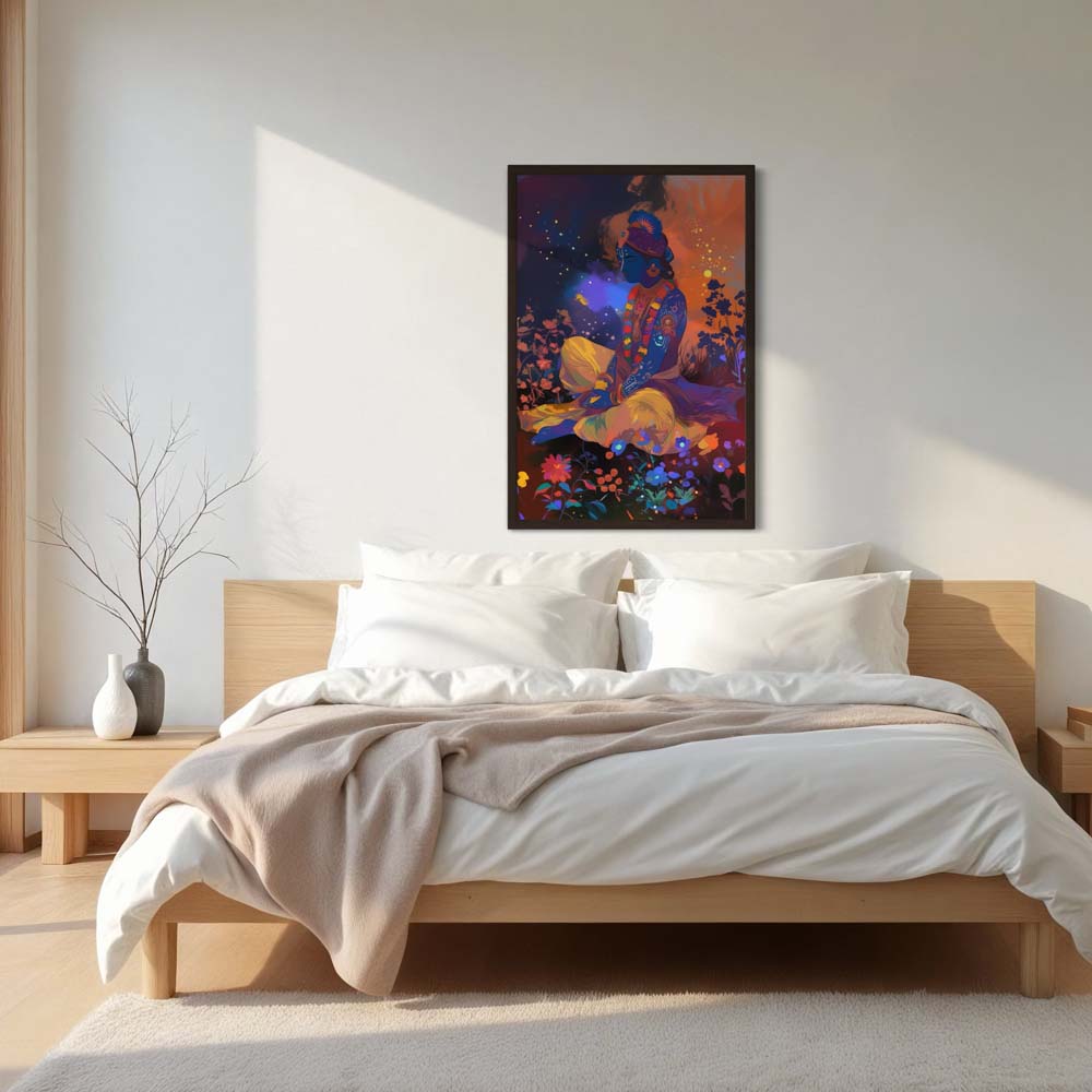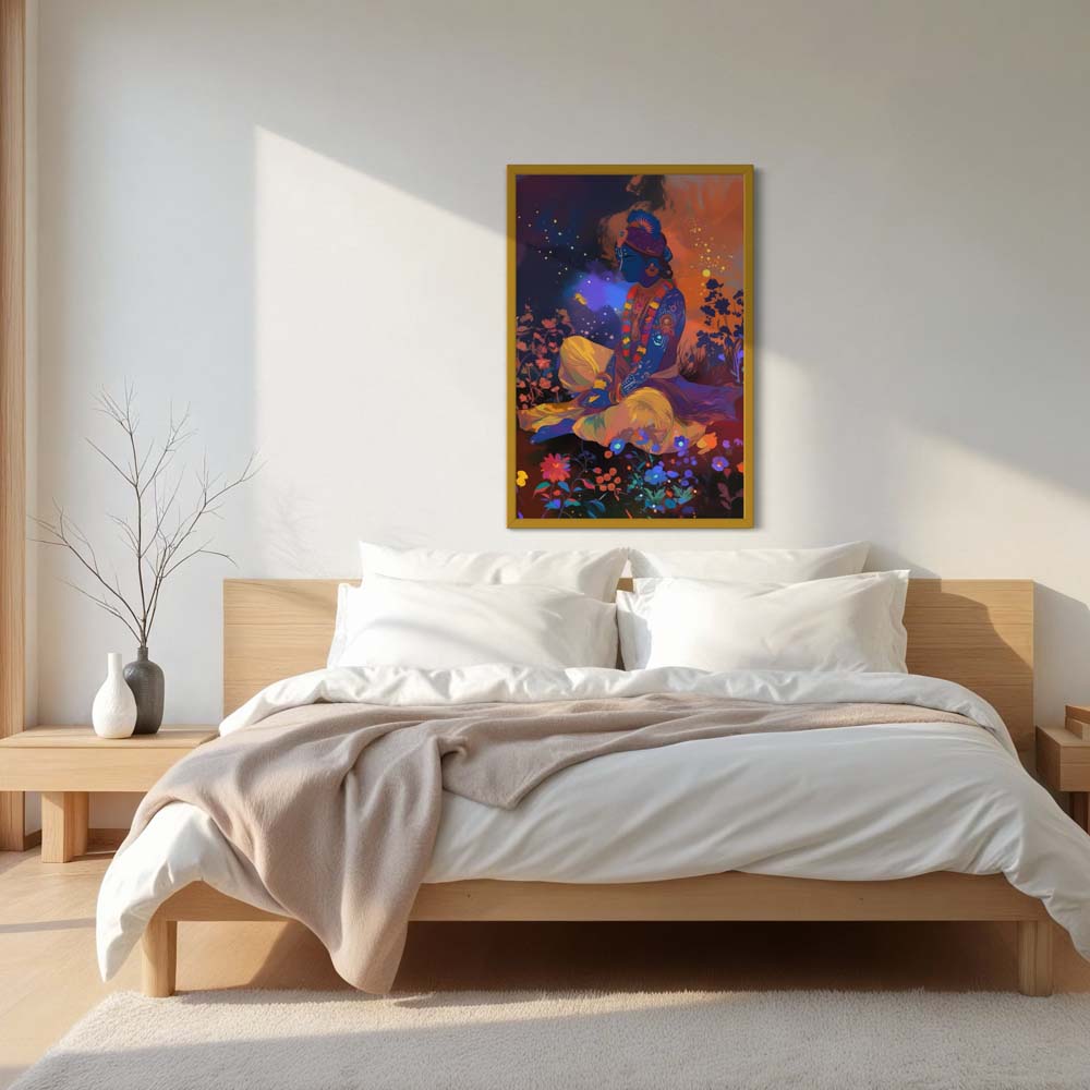 This vibrant modern illustration of Lord Krishna captures the divine serenity and beauty of the beloved deity. With His iconic blue hue, adorned in intricate ornaments and floral garlands, Krishna is depicted meditating amidst a surreal background of colorful blooms and a cosmic night sky. The fusion of contemporary design elements with traditional motifs creates a harmonious visual narrative, emphasizing His divine connection to nature and the universe.