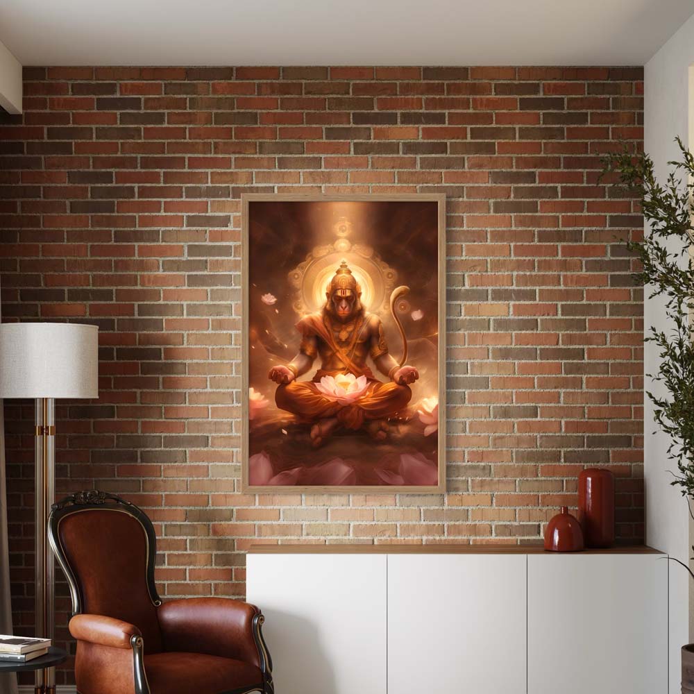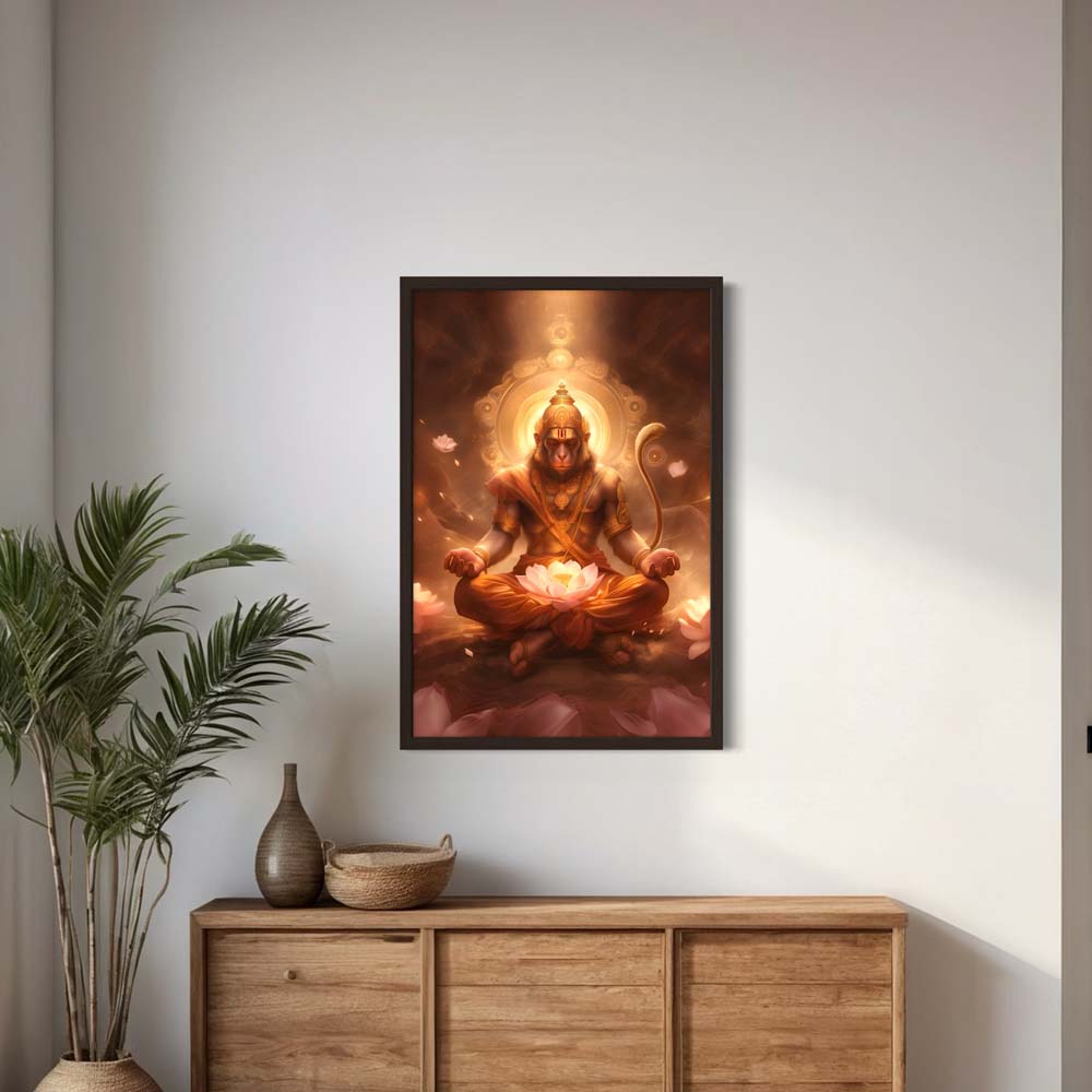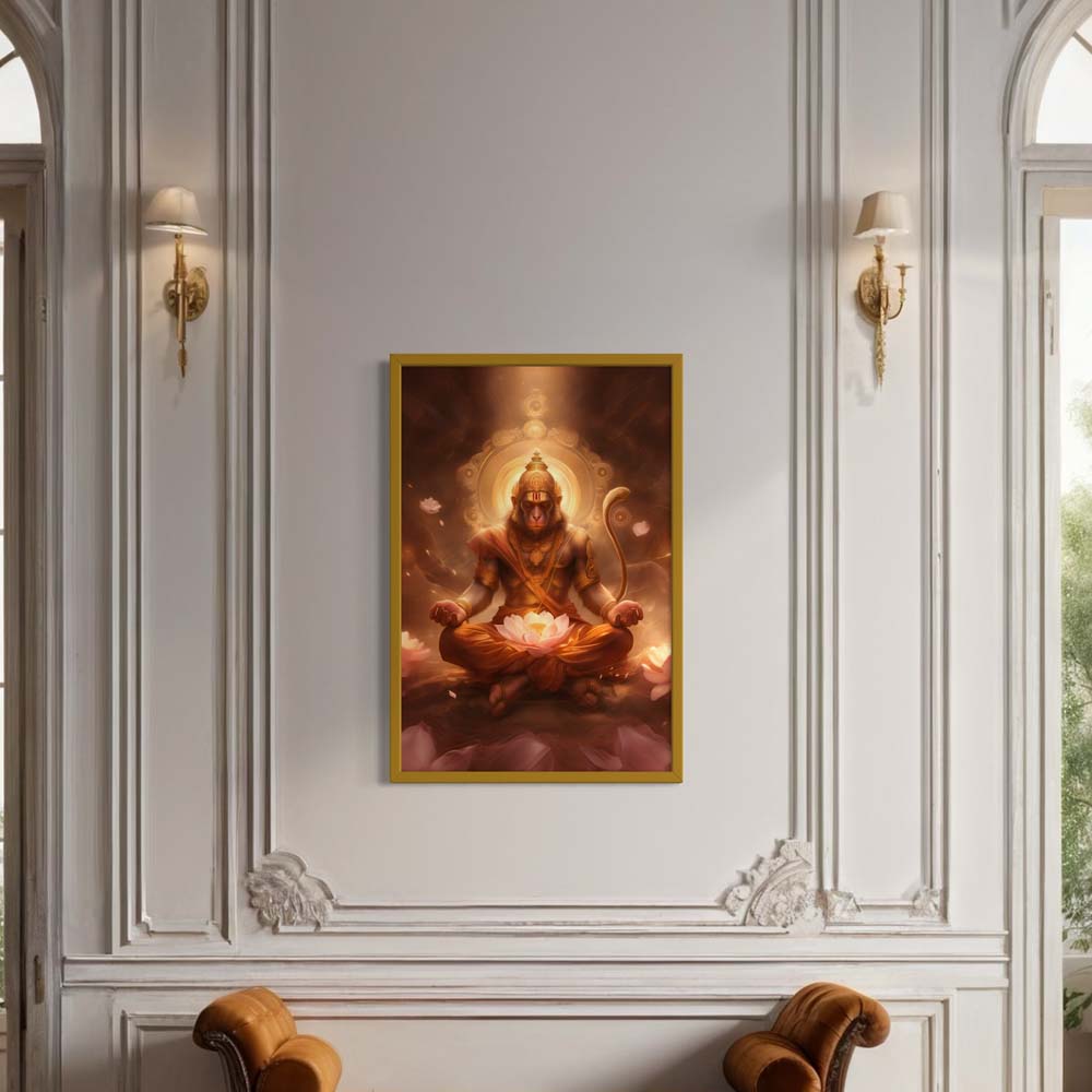 This serene depiction of Lord Hanuman Ji captures his divine essence in a meditative state, radiating tranquility, devotion, and spiritual power. Seated gracefully in the lotus pose, he holds a glowing lotus flower, symbolizing purity, enlightenment, and unwavering faith. Encircled by intricate celestial patterns and a luminous golden halo, this artwork beautifully reflects his divine connection to dharma and selfless service. The meticulous detailing in his posture, ornaments, and sacred markings highlights his role as the ultimate protector and devotee. This masterpiece embodies Hanuman Ji’s balance of strength and humility, offering inspiration and peace to all who behold it.