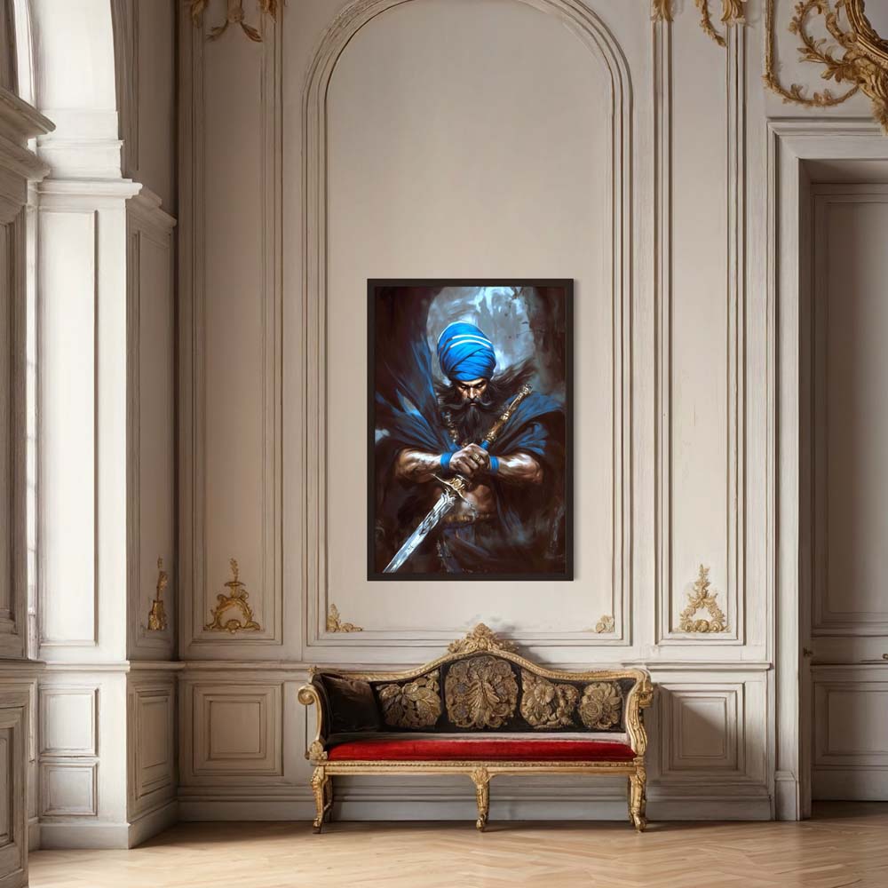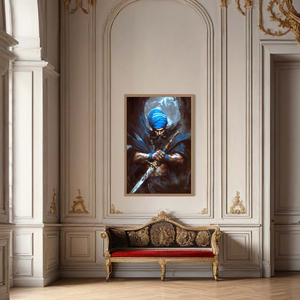 This powerful portrait captures the raw intensity and indomitable spirit of a Khalsa Warrior. The figure’s piercing gaze and commanding posture convey strength, resilience, and an unwavering commitment to justice. Clad in traditional blue attire with a radiant turban, the warrior wields a gleaming sword, intricately designed to reflect his martial prowess and spiritual devotion. The dark, moody background enhances the dramatic effect, symbolizing the battles fought for righteousness and the triumph of light over darkness.